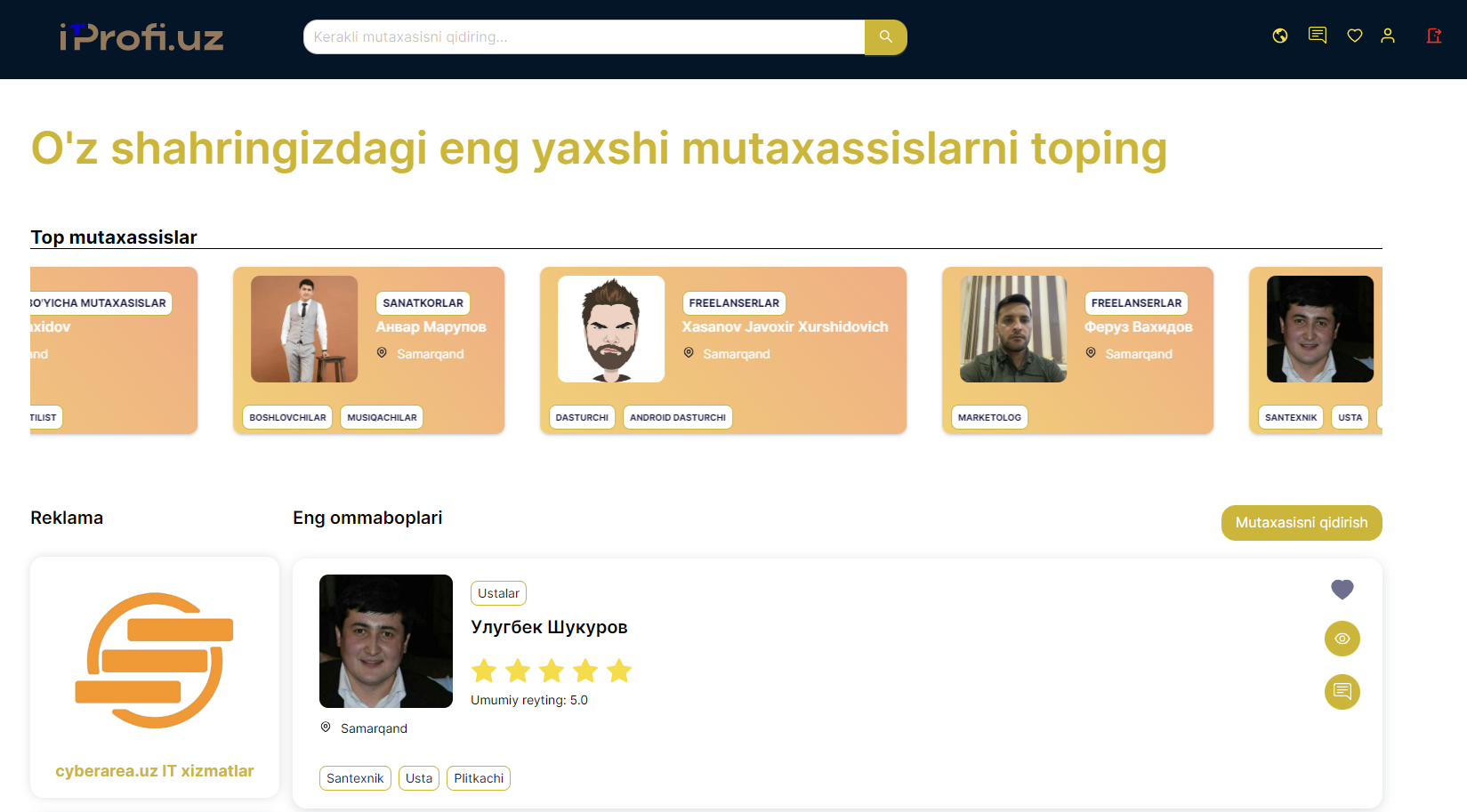 Men sizning vaqtingizni yo'qotishingizni va qat'iyatsizlikni oldini olishga yordam beraman. Men olgan loyihalarga eng yaxshi echimni taklif qilaman. Mening ko'plab mijozlarim va brendlar o'z mamnuniyatlarini bildirgan. Biz sizga kerakli soha mutaxassislariga murojaat qilib, biznesingizni rivojlantira olamiz.